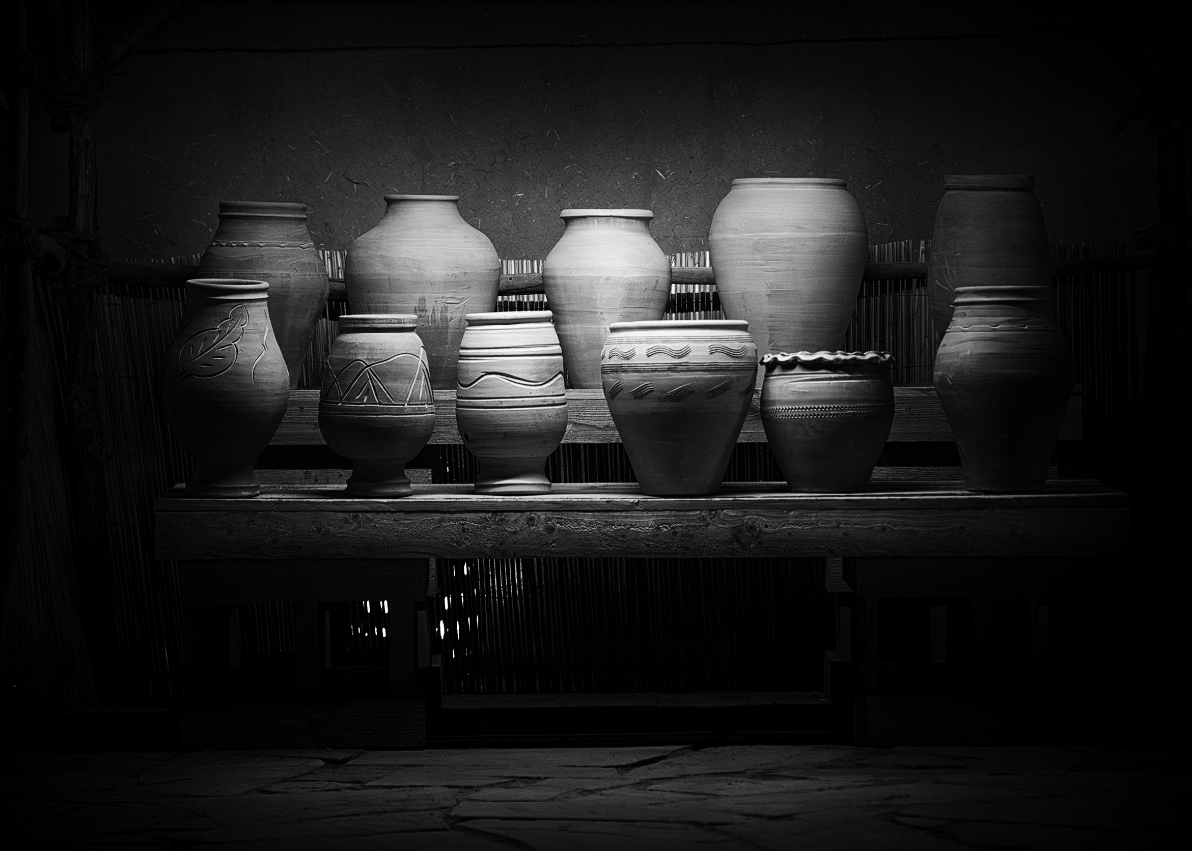 Wandering through the old souk of AlUla, I came across a rustic wooden shelf brimming with traditional pottery. Each pot, uniquely shaped and adorned with intricate designs, seemed to whisper stories of AlUla’s rich heritage. The setting was simple yet profoundly evocative, with pots lined up under the soft, ambient lighting of the souk, casting gentle shadows that played with the contours of the earthenware.