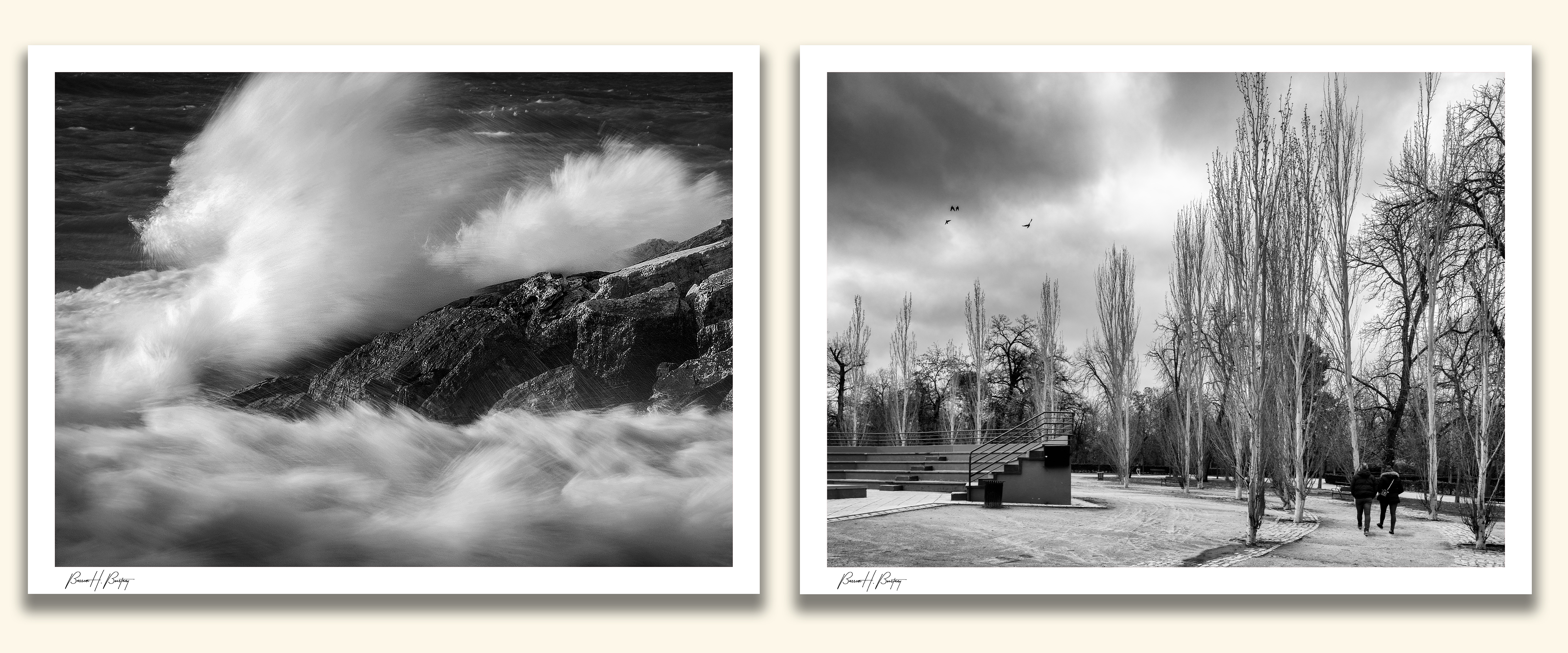 In quiet contrast, the second image presents a still, subdued urban landscape. Tall, leafless trees stretch upward into a heavy sky, forming a brittle colonnade through which a narrow path winds. Two small figures, bundled in winter clothing, walk together down this path, unhurried, side by side. Their presence is modest, nearly swallowed by the stark geometry of the landscape, but emotionally resonant. Where the first image roars, this one whispers. It is not the grandeur of nature but the subtle intimacy of shared space that defines the scene. This photograph speaks of human vulnerability, companionship, and the gentle weight of passing through the world together.