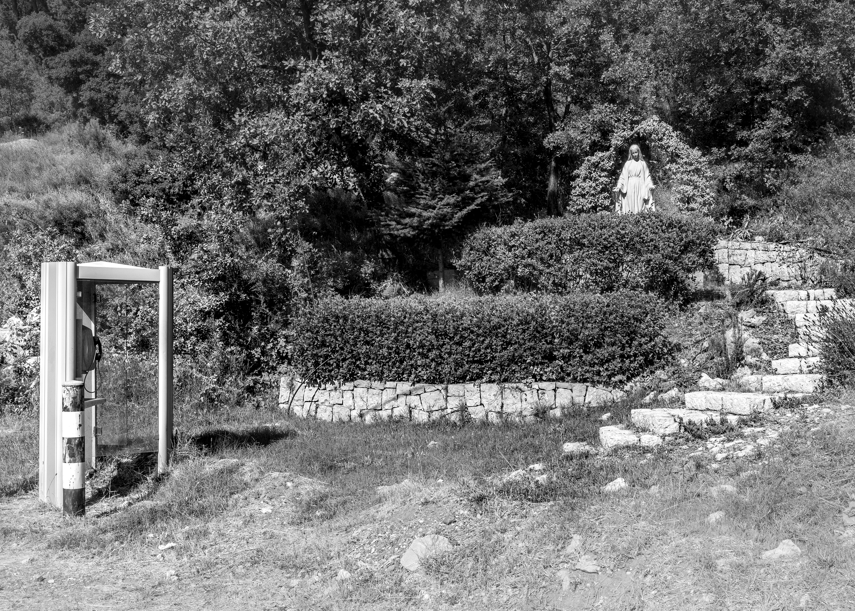 While driving through the curving roads that connect one village to the next, I see the signs of the feast everywhere, clusters of candles on balconies, flowers left at roadside shrines, and processions moving through narrow streets. And then, I pass an old phone booth at the edge of a path, its receiver long gone. I can’t help imagining a call that needs no number. Above, Mary stands in the trees, her gaze steady, her hands open, a reminder that some lines are never disconnected.