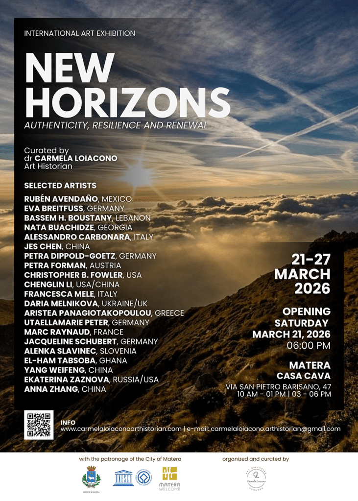 I was honored to be invited by Dr. Carmela Loiacono to participate in the exhibition “NEW HORIZONS – Authenticity, Resilience and Renewal “, held at Casa Cava in Matera, Italy, from March 21 to 27, 2026.