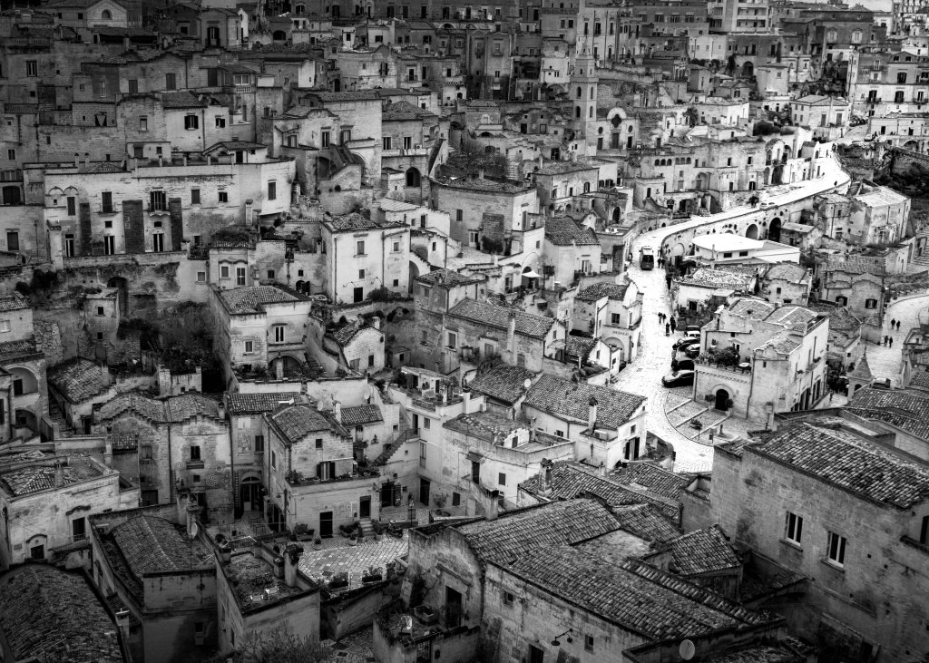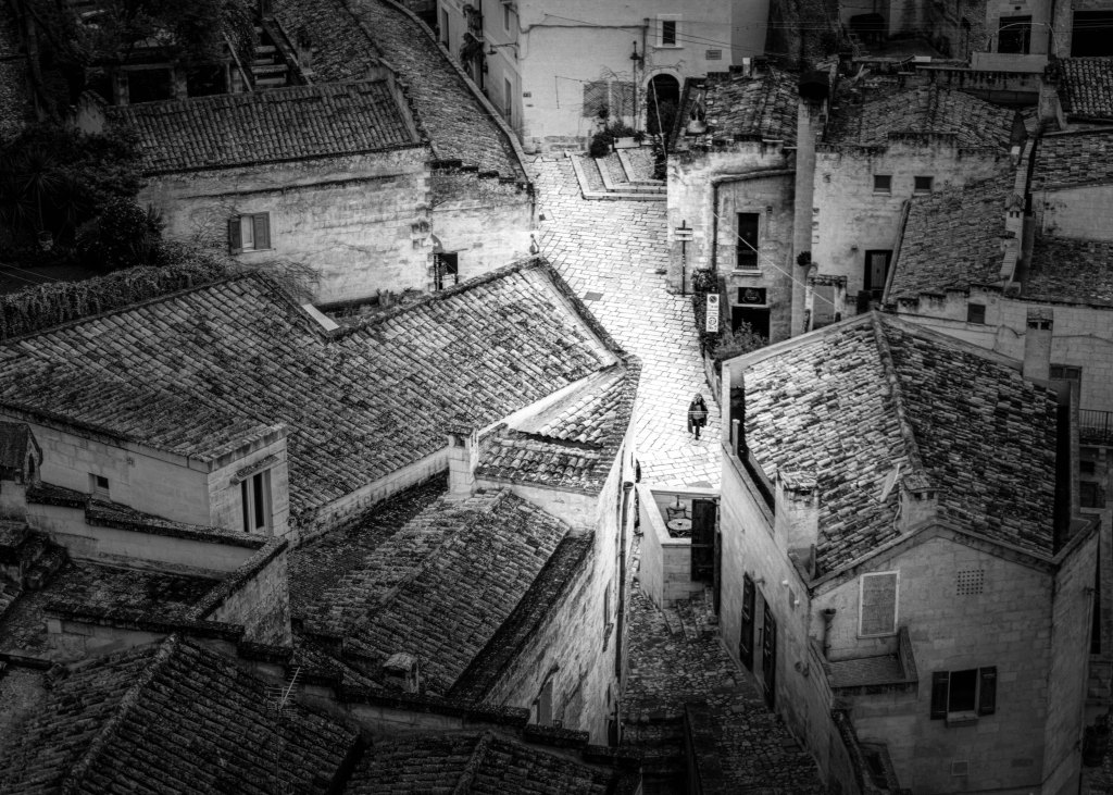 At times, human figures appear small within the scale of the city. They do not dominate the space, they belong to it. Their presence reinforces the idea that Matera is not monumental in intention, but human in essence.